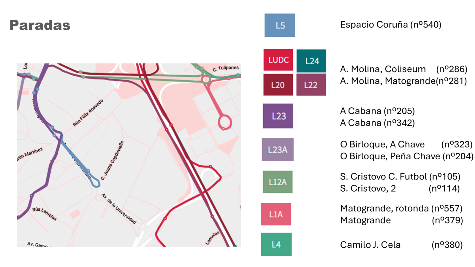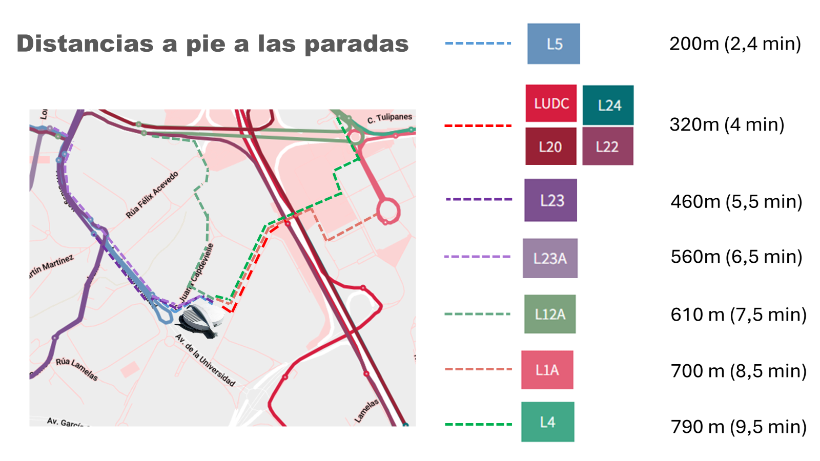 El recorrido de la línea UDC para esta jornada será el habitual con salida de P. Pontevedra (Eusebio da Guardia) y con paradas a lo largo de Juan Flórez, San Pedro de Mezonzo, Alfonso Molina-Plaza de Madrid, Pajaritas y Alfonso Molina-Coliseum, que será la parada de destino para acceder al Coliseum. Para el regreso a la finalización del partido será necesario cruzar la Avda. de Alfonso Molina por el puente peatonal.
